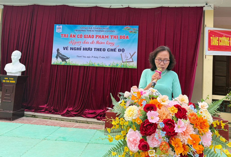 Trong khoảnh khắc đầy lưu luyến chia tay, tập thể cán bộ, giáo viên và học sinh trường THCS Thanh Luông xin gửi tới cô giáo Phạm Thị Đóa những lời tri ân chân thành và sâu sắc nhất. Với chúng tôi, cô không chỉ là một giáo viên Lịch sử giỏi, một đồng nghiệp mẫu mực mà còn là một người chị, người cô tận tâm, giàu trách nhiệm và chan chứa yêu thương.